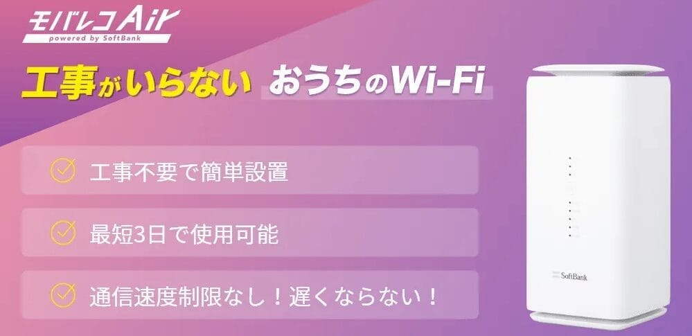 モバレコAirは、ソフトバンクが提供する高速インターネットサービスで、手軽に自宅でWi-Fi環境を整えることができます。光回線とは異なり、工事不要で利用開始できるため、引っ越しが多い方や、賃貸物件に住んでいる方にも最適です。お申込み完了から最短3日でお届け送料は無料。なので、とにかくすぐに利用したい方や急な引っ越し、設定などわからないのでコンセントにさすだけで使える簡単なのがいい方にはとっても便利ですね。