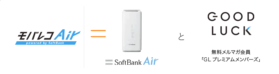 ソフトバンク株式会社と株式会社グッド・ラックがアライアンス契約を結び、ソフトバンク株式会社が提供するSoftBank Airのインターネット回線と、株式会社グッド・ラックが提供する「GL プレミアムメンバーズ※1」サービス(会員費不要)を、セット販売商品にすることで、SoftBank Airが「モバレコAir」というサービス名称に変わりました。 これによって、SoftBank Air をアライアンスモデルとしてご提供することが可能となりました。