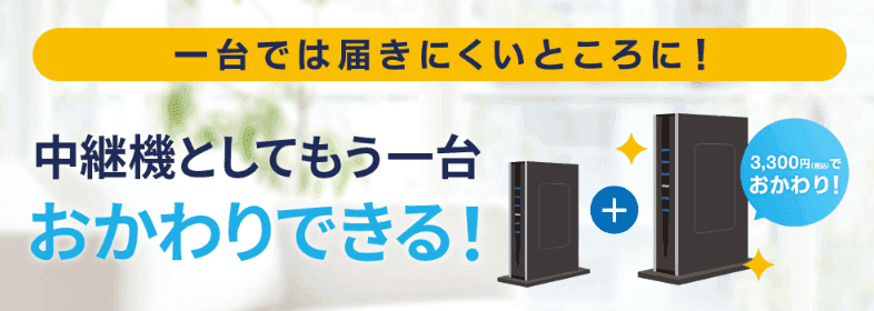 このとき「おかわりWiFi」サービスを利用すれば、たった3,300円でWiFiルーターが購入可能。2台のWiFiルーターを使えば、WiFi電波のエリアが2倍広くなるので、家中どこにいてもネットがつながりやすくなります。